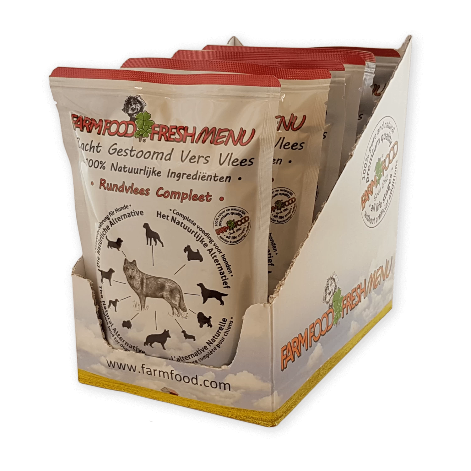 De Farm Food Fresh Menu is verkrijgbaar in 2 verpakkingseenheden; een pouch van 125 gram en van 300 gram. Daarnaast is het beschikbaar in 2 smaken; pens & hart compleet en rundvlees compleet.