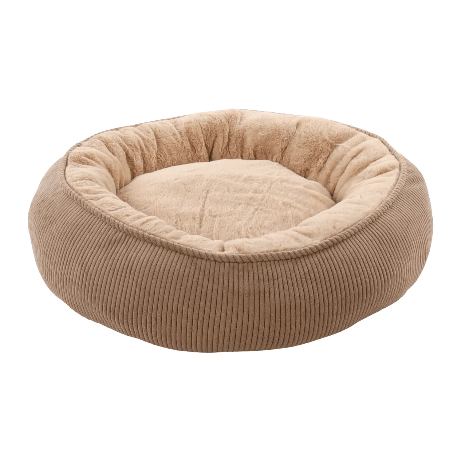 De Flamingo Mand Rond Colette is een mand voor katten en kleine honden. De buitenkant is voorzien van stevig, maar zacht ribfluweel. De binnenkant is gemaakt van zacht pluche. De rand is goed gevuld zodat jouw huisdier het hoofd op kan rusten. Het kussen is aan de ene kant voorzien van ribfluweel en de andere kant van het zachte pluche in dezelfde kleur. Je kan zelf kiezen welke stof je boven hebt liggen, want het kussen zit los van de mand. De hoes van het kussen kan eenvoudig er vanaf gehaald worden door middel van een rits. De onderkant is voorzien van antislip zodat de mand stevig op zijn plek blijft liggen.